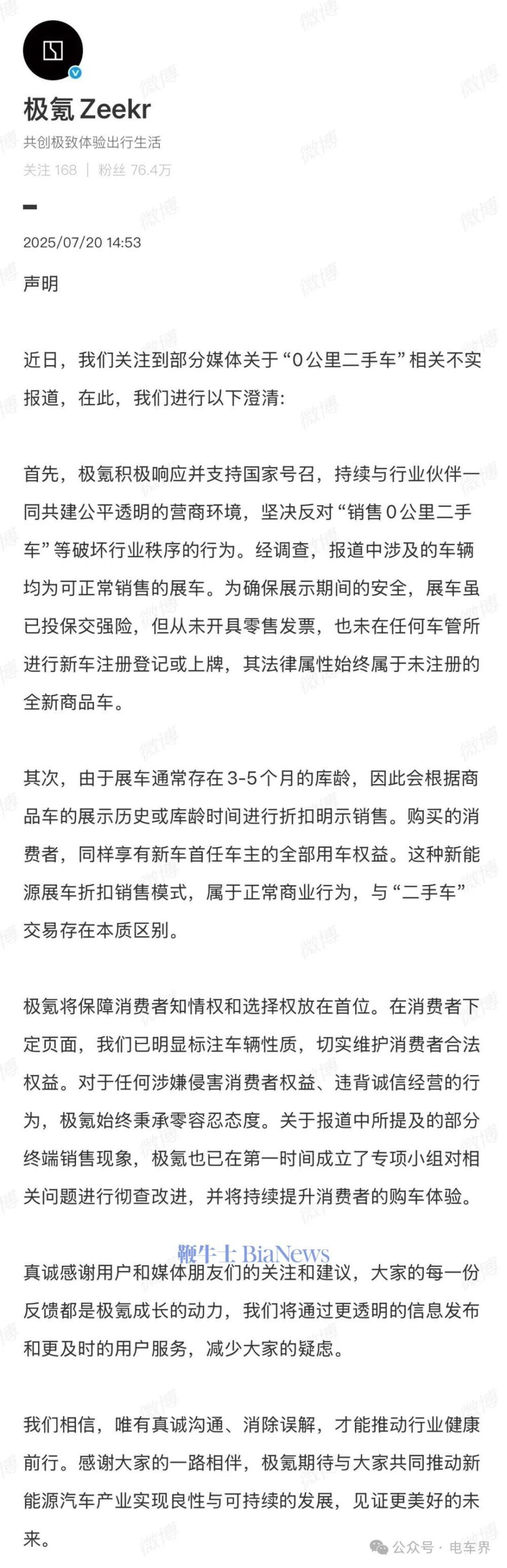 (电车界)极氪回应0公里二手车:卖的是展车,以“限时优惠”名义销售给消费者,极氪直营门店疑似将已投保过户的库存车辆包装为“新车”,比亚迪抄底了